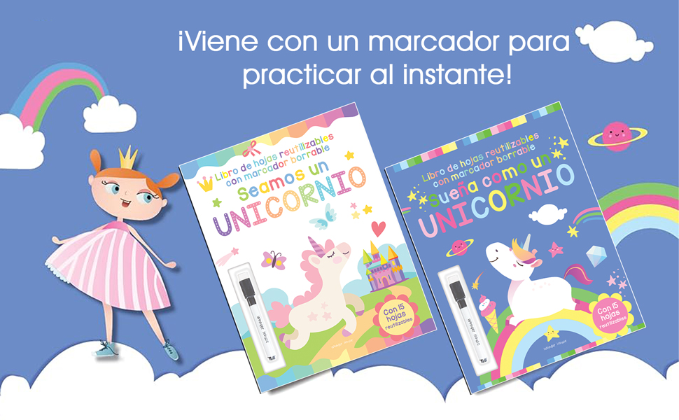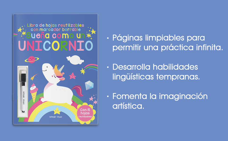 Reusable Wipe and Clean Let's Be a Unicorn Activity Book – Spanish offers endless fun for young unicorn enthusiasts! This interactive activity book features wipeable pages, allowing children to complete a variety of engaging activities in Spanish, such as drawing, tracing, and writing, and then wipe them clean to start again.